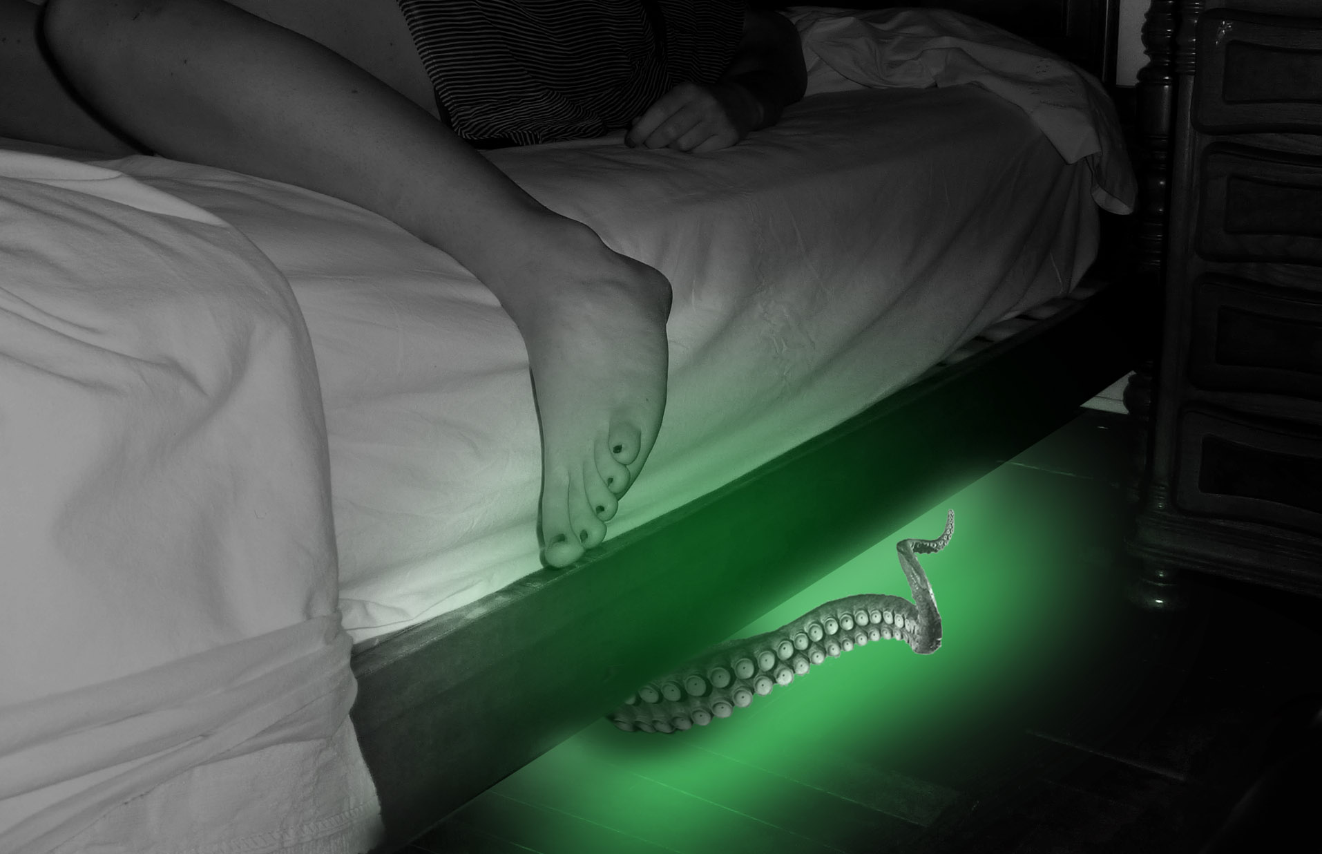 Poco a poco, unos tentáculos fluorescentes y pegajosos comenzaron a emerger por debajo del somier. Mis piernas y brazos desnudos desprotegidos por la poderosa sábana quedaron a merced de aquel monstruoso ser que habita bajo mi cama. Ahora sé que es real, sé que existe y que mis padres han estado mintiéndome durante 26 años.